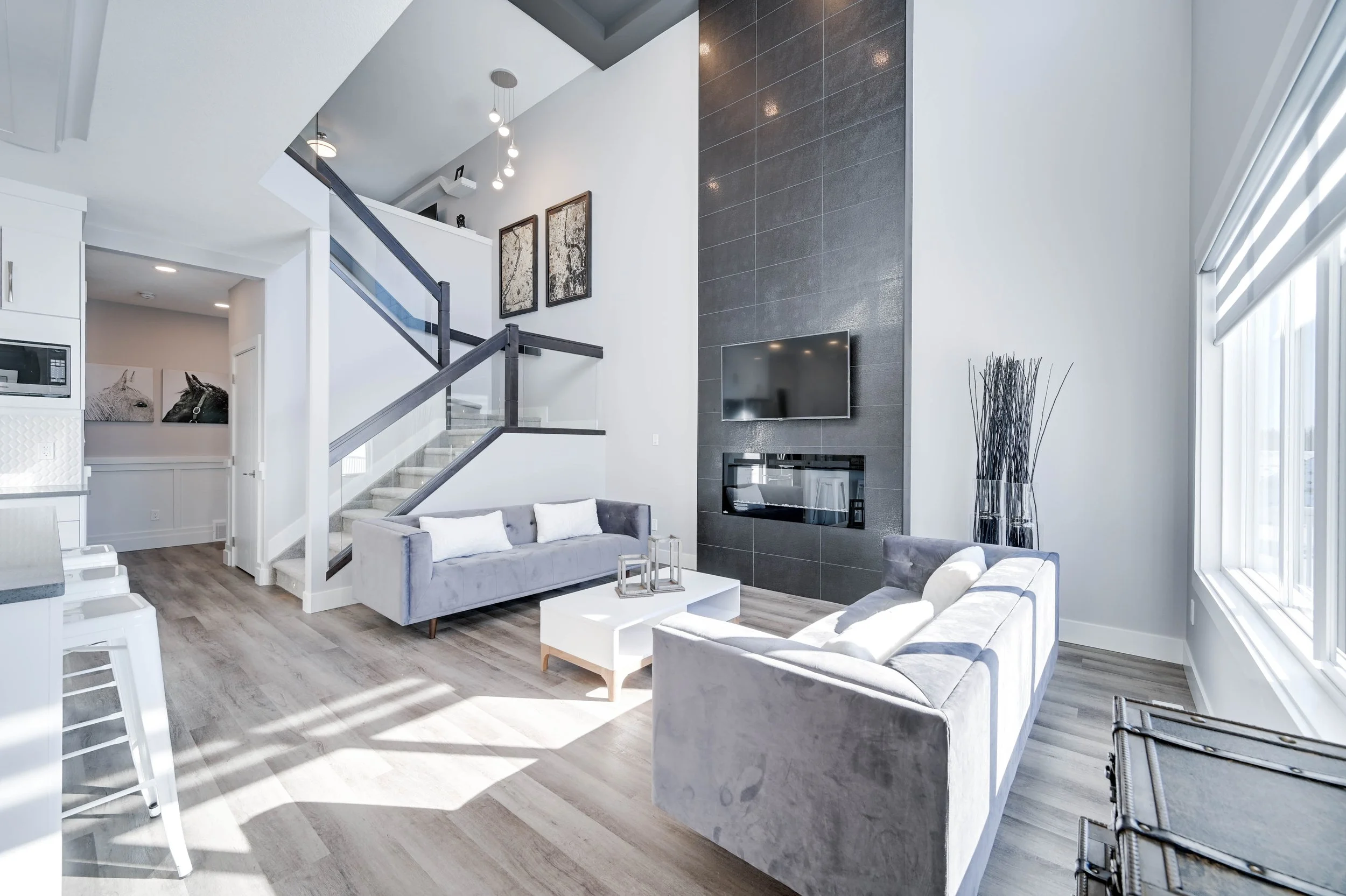 The Great Room features 18-feet high ceilings and a 60-inch electric fireplace with stunning triple pane windows.